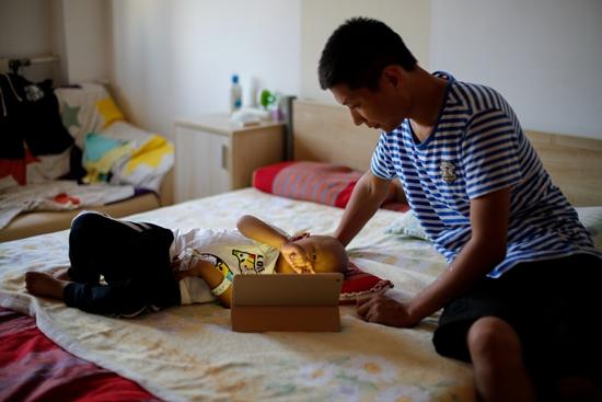 为了安抚女儿,张丽会举着平板电脑播放动画片。腾腾累了,张丽会轻轻拍着她。如果能睡着,这4个小时会过得快一点。