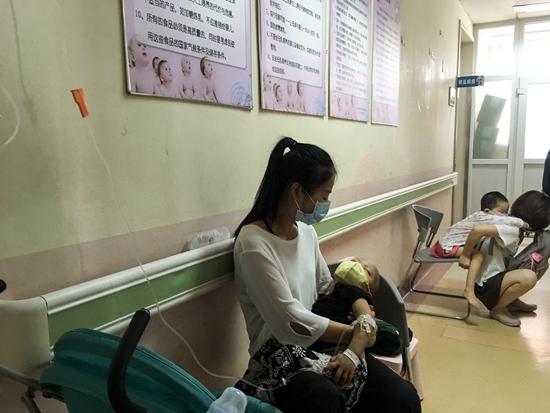 因为没有床位,童童只能在病房外的走廊里输液,在妈妈的怀里睡着了。车怡岑/摄