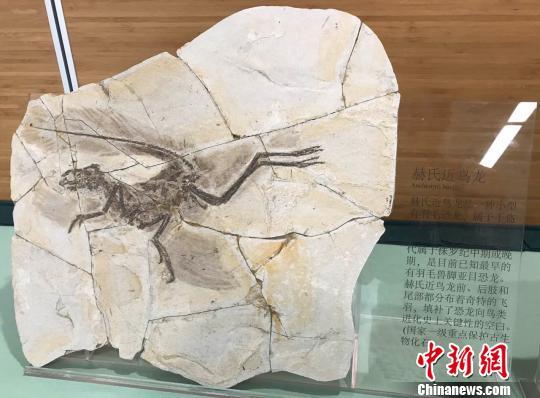 赫氏近鸟龙(国家一级重点?;す派锘?,赫氏近鸟龙是一种小型有羽毛恐龙,属于手盗龙类的伤齿龙科?;⑾钟诹赡。婺甏粲谫藜椭衅诨蛲砥?,是目前已知最早的有羽毛兽脚亚目恐龙。赫氏近鸟龙前、后肢和尾部都分布着奇特的飞羽,填补了恐龙向鸟类进化史上关键性的空白?!≈Sㄓ?摄