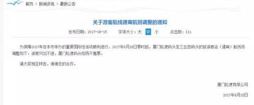 据厦门轮渡有限公司消息,为保障 2017 年在本市举办的重要国际性活动顺利进行,2017 年 8 月 18 日至2017年8月27日,厦门轮渡码头至三丘田码头旅游客运航线的通宵航班(00:00—6:30)游客只出不进;2017年8月28日至2017年9月7日,厦门轮渡码头至三丘田码头旅游客运航线的通宵航班(00:00—6:30)停止运营。