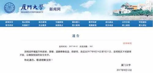 因校园环境提升和房屋、围墙、道路维修改造,经研究,决定从2017年8月14日至9月11日,思明校区不对游客开放,以确保校园的安全有序。