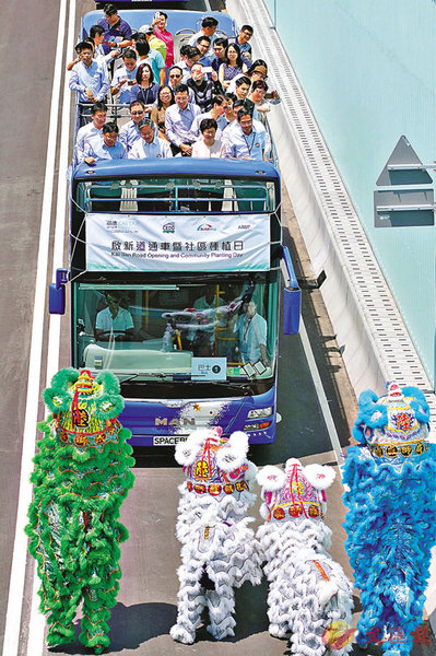 香港特区行政长官林郑月娥乘坐开篷巴士为启新道主持通车仪式。香港文汇报图