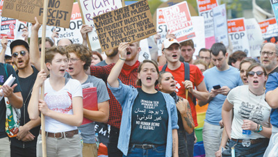 连续出现的对抗示威活动使美国陷入一片混乱之中。弗吉尼亚暴力事件后,多地兴起了拆除美国南北战争时期南方邦联纪念雕像的运动。在北卡罗莱纳州达勒姆市,人们高喊着“美国拒绝3K党”“美国拒绝法西斯”等口号,将一座内战时期邦联士兵的雕像推倒在地。这座雕像建于1924年,高15英尺,底座一面雕刻着邦联旗帜。