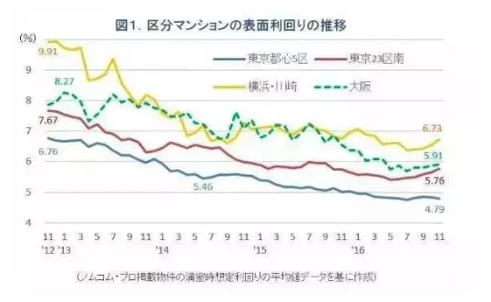 相较于东京,大阪的公寓回报率是更高,为5.91%(上图绿线)。
