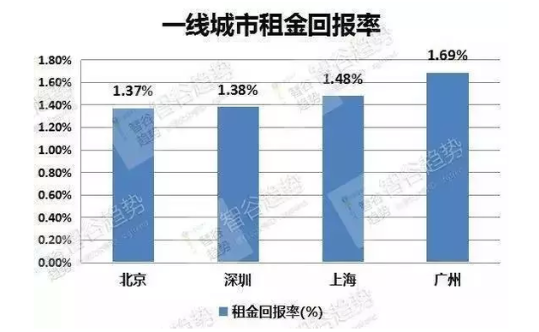 四个城市中,北京的租金回报率最低,以1.37%在百城里排名第96位,其次是深圳(1.38%)、上海(1.48%)和广州(1.69%)。排名分别为第94位、89位和95位。