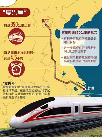 中国铁路总公司有关负责人表示,“复兴号”率先在京沪高铁实现350公里时速商业运营,将为沿线各大中心城市之间人民群众出行提供更多选择,更好地满足广大旅客对不同速度等级高铁运输的需求。
