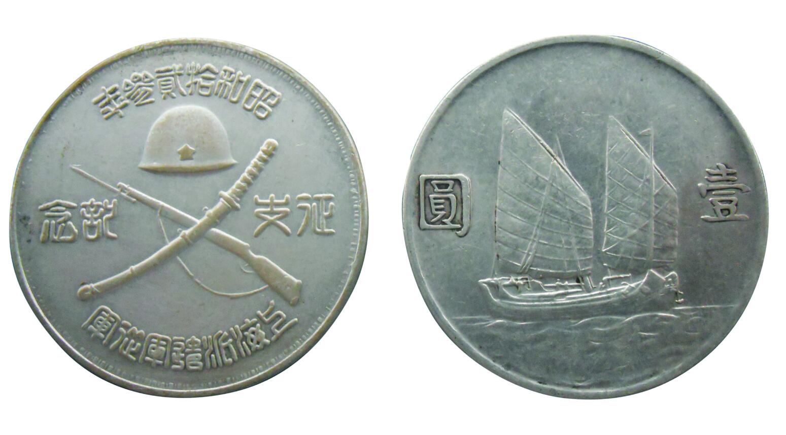 如图1所示这枚银币,重26.58克,直径39.25毫米,厚2.6毫米,为白银铸造而成,声音与普通银元无异。该币正面图案:上刺刀的步枪(即著名的三八大盖)和军刀交叉、中间上方一顶钢盔,“征支纪念”四字由右至左铸在两边,上下各铸一行环形文字,上边是“昭和拾贰叁年”,下边为“上海派遣军从军”;背面却是孙中山像银币(船洋)。背面的帆船图案,当是“征支纪念”的一种版别。