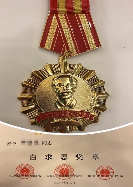 “白求恩奖章”是1991年《全国卫生系统荣誉称号暂行规定》中设置的荣誉称号,由人事部、卫生部共同颁发。以著名国际人道主义医生白求恩名字命名,旨在表彰在医疗卫生战线上做出突出贡献的医疗卫生工作者。