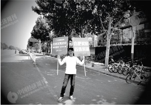 7月底,《中国经济周刊》记者顶着烈日来到合肥,在地铁1号线包公园站踏上了去往滨湖的列车,半个小时左右,在滨湖会展中心站下车。刚出地铁站台,一股热浪扑面而来,记者一眼瞥见马路对面一个穿着绿色T恤的男孩,手里举着两块红色大牌子,上面分别写着“合肥买房、首选滨湖”“滨湖新地城、红星美凯龙旁”。记者举起相机想拍照,男孩却将展示牌收了起来,不让拍。男孩说,他只是开发商雇来拉客的,要是记者同意跟他去售楼处登记看房子,他就可以得50元,这样他才会同意拍照。记者应允。