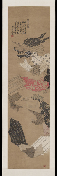 鉴赏八破画是一个由远及近、由近及远的过程。最初观者可能把焦点放在像拼图碎片一般的画面上,对描绘物品进一步辨读,才能了解画的主旨?;蛘叻垂?,从局部细节再到整体画面。展览的入口处展示了画家朱纬(1836-1908之后)在太平天国时期创作的《百年图》(1908),画面近看是残破书页的堆砌,远看则是一个龙的图形。用这幅画作为引子,展览鼓励观众从多种角度解读八破画的不同层面。