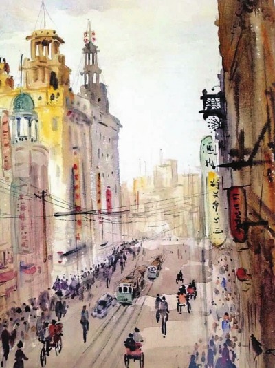 哈定经典水彩画 《繁忙的南京路》?!?展方供图)
