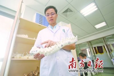 南方医科大学深圳医院骨科专家展示3D打印的骨骼模型。摄影:南方日报记者 朱洪波