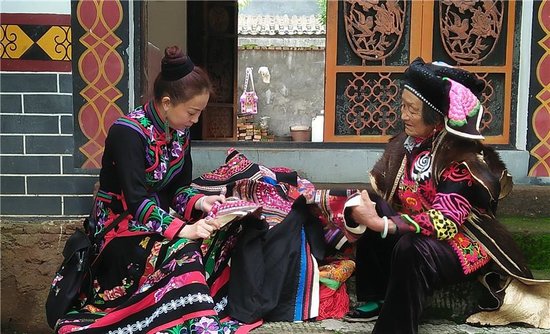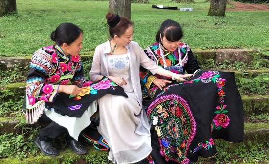 罗珺(左)在和彝族妇女讨论传统彝绣技法。