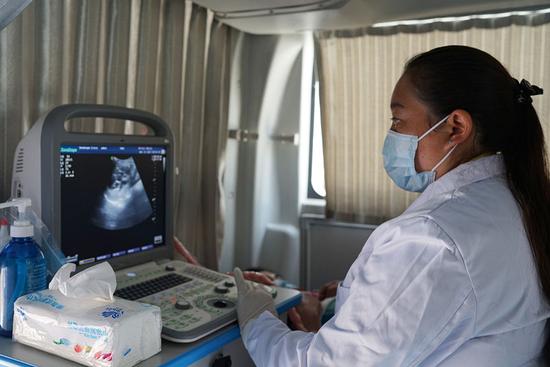 4月21日,一名医生在拉萨街头的包虫病快检移动工作站内为群众进行B超检查。新华社记者索朗德吉摄