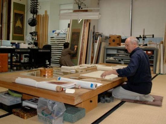 负责修复古画的 Asian Conservation Studio,是亚洲之外最古老的亚洲绘画修复室。1907年成立时,它被置于日本美术家冈仓天心领导的亚洲艺术部之下,由日本修复师 Motokichi Tamura统筹,最初的任务只是?;と毡净婊?。1995年,亚洲部主任吴同在策划中国宋元画品名展时,发现展品有不同程度的损伤,急需展开修复,而中国绘画所需的修复技术及材料应用与日本、朝鲜的绘画均不相同,因而中国书画修复室在当年成立。在 Starr Foundation和 Carpenter Foundation的赞助下,亚洲绘画修复室增加了中国书画修复师,并扩建了中国书画修复室。