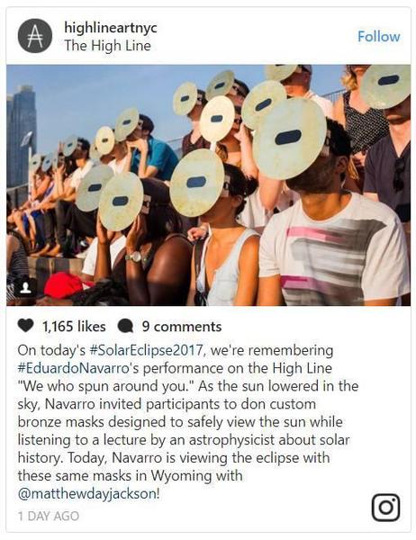 “在今天的日全食活动中,我们应该回忆起之前Eduardo Navarro曾在高线公园做过““We who spun around you”的演出。随着太阳缓缓从天际落下,Navarro邀请参与者佩戴定制的青铜面具观看太阳,同时听天文物理学家讲述有关太阳的历史。今天,Navarro在怀俄明州与@matthewdayjackson 一起用这种面具观看日全食”。图片:highlineartnyc的Instagram