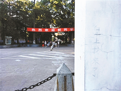 据爆料人张先生称,此前看到清华大学日晷被刻字,“今天来清华游玩,竟发现象征清华大学的老校门居然也惨遭毒手。这是清华的象征性建筑,怎么会有人如此对待呢?”张先生告诉北青报记者,看字迹,“皇上我来了”几个字应该是硬物刻画的。