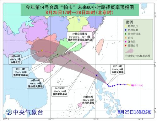 大风预报:8月25日20时至8月26日20时,巴士海峡、南海东部、台湾东南海面和广东中东部沿海将有6~7级大风,其中南海东北部的部分海域和中东部偏北海域、巴士海峡西部将有8~9级大风,“帕卡”中心经过的附近海域风力可达10~11级,阵风12~13级。