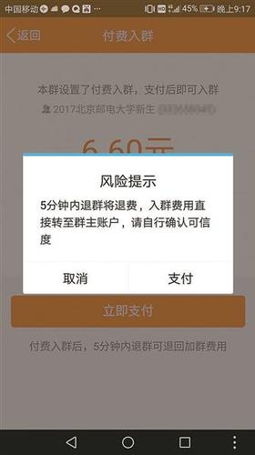 即将就读北京邮电大学的“准大学生”王立(化名)告诉北青报记者,他所在的一个“2017北京邮电大学新生”QQ群,近日被改成了收费群。“这两天看群里聊,才发现,现在对入群的新生要收费6.6元,已经有好几个17级的新生,都说付了钱才进来的?!蓖趿⒏嫠弑鼻啾钦撸泄芾碓弊猿剖辗选笆俏朔乐刮薰厝嗽苯骸?,但他说“(不想付费的)可以私信群主或管理员,证明身份后进群”。