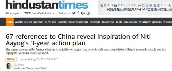 《印度斯坦时报》(Hindustan Times)8月28日报道,印度财政部长贾特里(Arun Jaitley)24日公布了该计划。该计划在承认和盛赞中国经济实力的同时,也指出了印度发展中的不足。