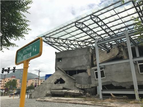 玉树抗震救灾纪念馆外,地震遗留受损房屋