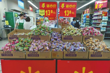 在一家综合超市的月饼货架区,各种散装月饼应有尽有,“水果味月饼卖得很好。”超市售货员说。超市销售的大部分月饼,包装上都标注有详细的馅料成分,水果味月饼主要配料几乎都是冬瓜蓉,有的包装上甚至明确写着“荔枝味冬瓜蓉月饼”。而售货员似乎并未注意到这一点,“我们卖的都是品牌比较好的,但确实没发现配料都一样?!奔钦咦叻每吹?,市面上销售的带水果字样的月饼,几乎都是用冬瓜做主要馅料,仅一家蛋糕店销售的“紫薯草莓流心月饼”配料表写明是紫薯、芸豆和鲜草莓?!拔页怨簧偎兜脑卤?,确实口感都差不多?!笔忻窳跖克底约貉≡卤饕故强醇鄹窈涂谖叮永疵幌牍对卤镌床⒚挥兴?。