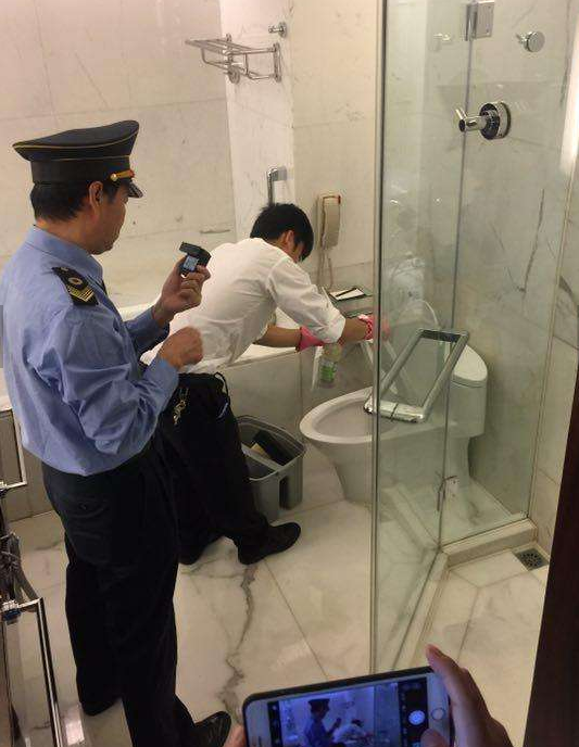 其中,针对此次五家涉事酒店中4家位于朝阳区的酒店 ,9月5日上午8:00,监督所紧急部署,当日立即对辖区内被曝光的4家五星级酒店组织多科室联合检查。检查内容包括:1.棉织品的清洗、消毒、保洁及出入库记录,外送清洗单位的资质索取情况;2.顾客用品用具一客一换一消毒的落实情况;3.消毒间设施配备及使用情况;4.客房卫生间清洗、消毒情况及顾客用品用具的保洁情况。对客房从业人员日常工作流程进行了现场考核,着重考核客房工作人员对客房日常的清扫、消毒、更换公共用品等环节。
