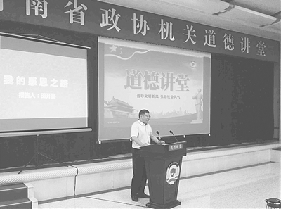 一花独秀不是春,万花开放春满园。田开喜在身先士卒传播感恩文化精神的同时,2016年组建成立了感恩文化宣讲团,多次走进党政机关和企事业单位的道德讲堂作专题报告。今年6月28日,田开喜被邀请到河南省政协机关道德讲堂,作了两个小时精彩专题演讲,受到与会人员的一致好评。