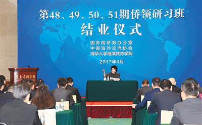 图为“第48-51期侨领研习班结业仪式”在北京举行。国侨办主任裘援平出席结业仪式并为学员授课。中新社记者张勤摄