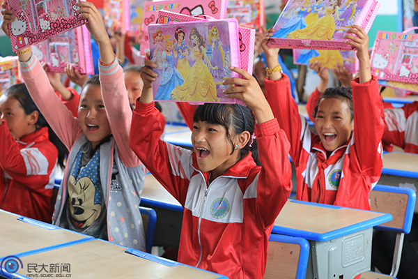 陈塘镇中心小学的孩子们领到了心仪已久的文具。马万玲摄