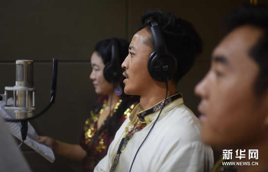 8月31日,青海省民族语影视译制中心配音演员仁青卡(中)在录音棚内为电视剧配音。新华社记者张宏祥摄
