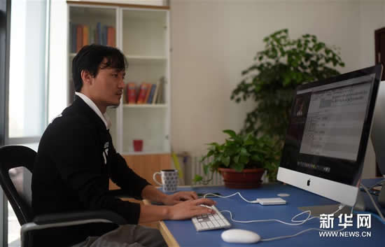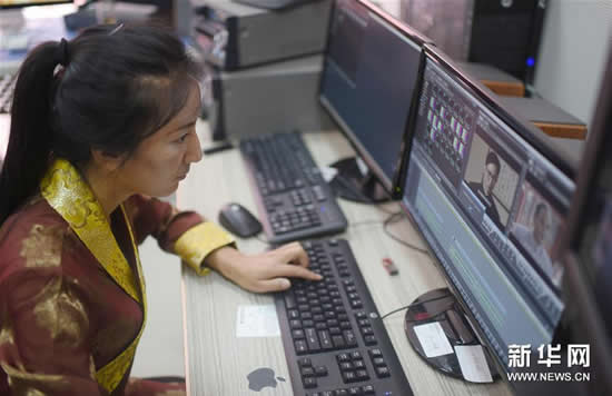 8月31日,青海省民族语影视译制中心技术人员色毛措在为译制节目制作藏文字幕。