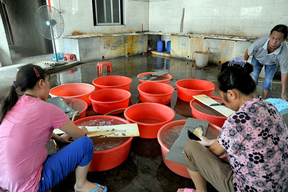 查获的小作坊工人正在对涉嫌走私的鱼翅进行初级加工。