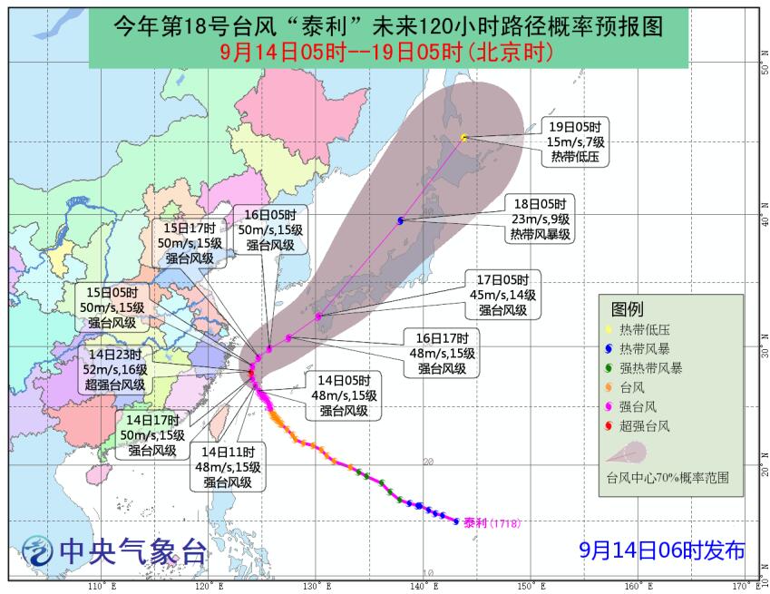 大风预报:14日08时到15日08时,长江口区、上海沿海、杭州湾、浙江沿海、东海大部、台湾以东洋面将有7-9级大风,其中东海中部部分海域风力可达10-12级,“泰利”中心经过的附近海域风力可达13-15级,阵风16-17级。