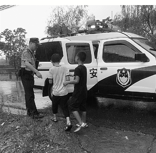 民警上前查看,果然两个孩子躲在隐蔽处,全身湿透瑟瑟发抖,他们身上的书包却不见了。民警把两个孩子带上了警车,并拿毛巾给孩子们擦干。