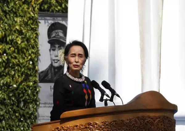2月12日,在缅甸掸邦彬龙镇,昂山素季在活动上致辞,呼吁缅甸所有民族武装加入和平进程。新华社/美联