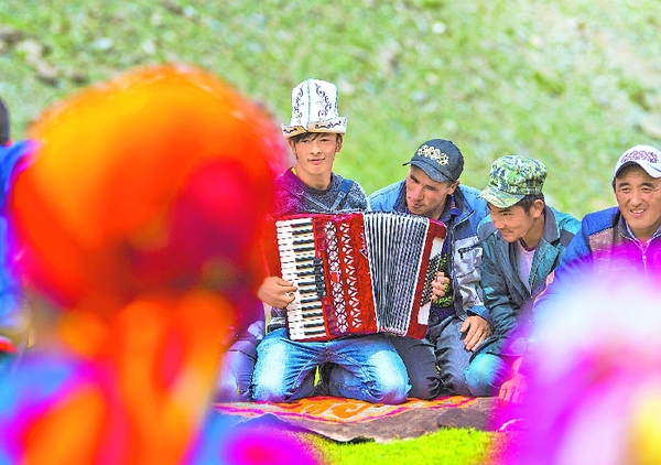 在“铁日孜窝孜”夏牧场,19岁的喀拉塔什其木干村村民买买提阿克木·阿不都热扎克在民间歌会——“约隆”会上表演(7月21日摄)。易地扶贫搬迁,是改变帕米尔高原牧民生活的可行路径。去年,搬迁方案传到阿克陶县克孜勒陶乡喀拉塔什其木干村“铁日孜窝孜”牧场后,得到了全体牧民的支持。这个夏季将是这里的牧羊人在“铁日孜窝孜”牧场度过的最后一个夏季。江文耀摄