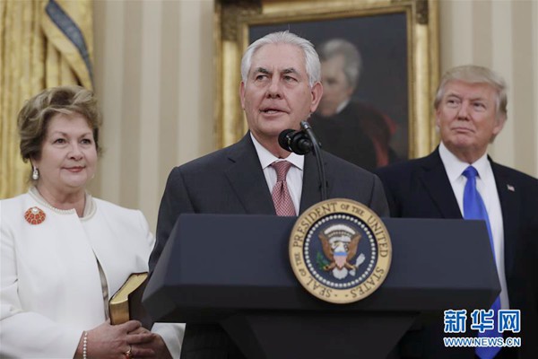 资料图:2月1日,在美国华盛顿白宫,新任美国国务卿雷克斯·蒂勒森(中)宣誓就职后发表讲话。新华社/美联