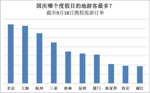 从旅行社的实际报名情况看,国内游的火爆态势已经成为必然。国内游将去哪里?携程对业内规模最大的跟团游、自由行订单统计看,截至9月18日,游客量排名前十的目的地省市依次是:北京、云南、海南、浙江、广西、福建、四川、湖南、上海、广东。北京、云南、海南位居国内游目的地前三甲。人气最高的目的地城市前十名是:北京、上海、杭州、三亚、桂林、昆明、厦门、张家界、西安、丽江。北京、上海、杭州排名前三。