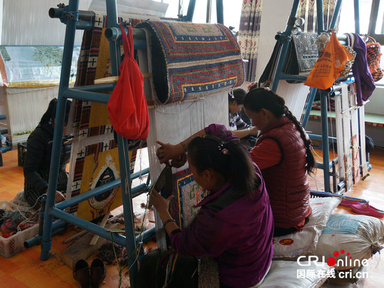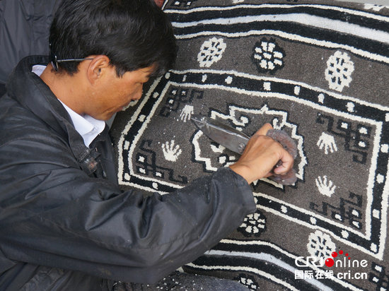刚编织好的藏毯毛线长短不一,工人用手工剪出层次。(秦胜瑞 郑安 冀媛)