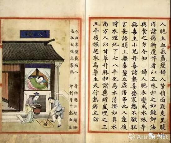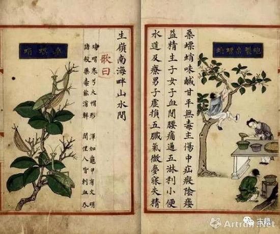 该书的“本草插图”,系经宫廷画师的艺术构思或艺术加工而成,表现出很强的艺术性。虽为本草而绘,但《补遗雷公炮制便览》的画风却格外细腻,生动地表现了当时社会的风物习俗,人物颜貌、妆饰、衣着栩栩如生;器物、家具、建筑惟妙惟肖,明代人生活场景跃然纸上。其美术价值不亚于任何古代写实画作精品。宫廷画师们使用的神奇画材矿物颜料宝石粉,更为画作增添了亮丽的色彩,历四百余年仍艳丽如新。