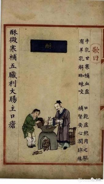 该书卷首有两幅极为精美的主题图。第一幅为“受教图”,绘制的是雷公下跪接受黄帝授书、传医道的场景,是根据《素问》中提到的雷公受教于黄帝的记载创作的。第二幅为“炮制图”,图中雷公端坐于上,周围有9名药工在切药、碾药、杵药、研药、煮药、蒸药、炒药、筛药、淘药,展示了古代炮制的主要手段和工具。