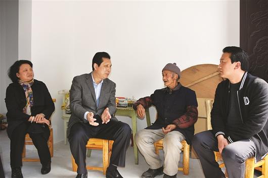 图为:省委统战部副部长、省工商联党组书记王兆民(左二)到贫困村调研精准脱贫。