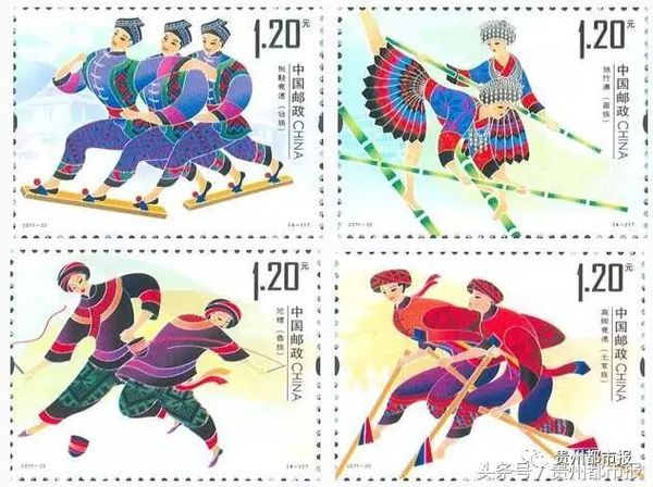 这套邮票一共4枚,邮票主图表现了我国南方少数民族独具特色的4个竞赛项目,分别为板鞋竞速(壮族)、独竹漂(苗族)、陀螺(彝族)、高脚竞速(土家族)。总面值4.80元。