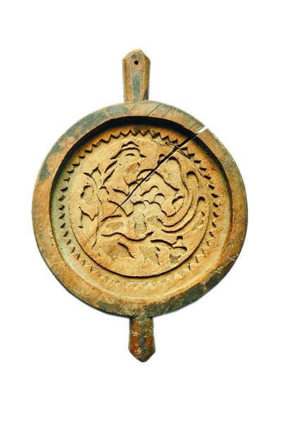 “凤穿牡丹”是月饼模具中的一件难得的佳品,是于进江在旧货市场一堆老家具当中偶然发现的,模具上落满灰尘,有些裂纹。其造型独特,具有双把手形式。这种样式在宋元时期比较多,明代以后就少了。此款是明嘉靖年间的作品,雕刻风格简洁明快?;嬷械姆锘嗽谔舻墓饷⑾禄盍榛钕?。凤穿牡丹的纹样在明代早期的瓷器、服饰上较为流行。在这件模具上还留有墨迹题刻,记录主家的姓氏、制作时间??杉诖吃卤闹谱魃?,也有为家族手工定制的。现如今,月饼制作很少再沿袭手工的习俗,月饼模具也离开了人们的视线。