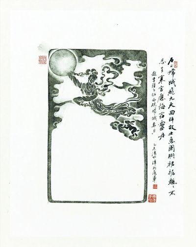 李瑾的《我拓我家》在天津巡展期间,恰值丙申中秋。她就用王洪增的这幅《奔月图》制作成一张中秋贺卡,发送给亲朋好友。她还给这张贺卡起了个别致的标题,叫作《拓个月亮贺中秋》。没想到,这个独特的贺卡引发了诸多网友的回馈和点赞,其中尤以四川日报老友杨文镒的微信最富诗意:“清晨,林鸟啼脆。中秋点开微信,一张古雅绝伦的自制拓片《奔月》贺卡最先跳出,乃著名文化学人和书法家侯军伉俪所赠。拓石艺术,本就难得,而出自名家之手,难免让人情思泉涌。李瑾《我拓我家》拓艺展近年南北会展,名流荟萃,声名远播,芳踪所至,时时怀想……”