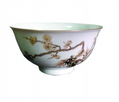 珐琅彩瓷器中的山水楼阁是常见的表现手法,传世稀少,十分珍贵。雍正珐琅彩墨彩山水楼阁人物碗是很有代表性的一件。所谓墨彩,是在白地上绘黑彩。通常以黑地绘五彩或三彩的叫黑彩,墨彩所呈现的简约、单纯、娴静使这种瓷器达到应得的效果。