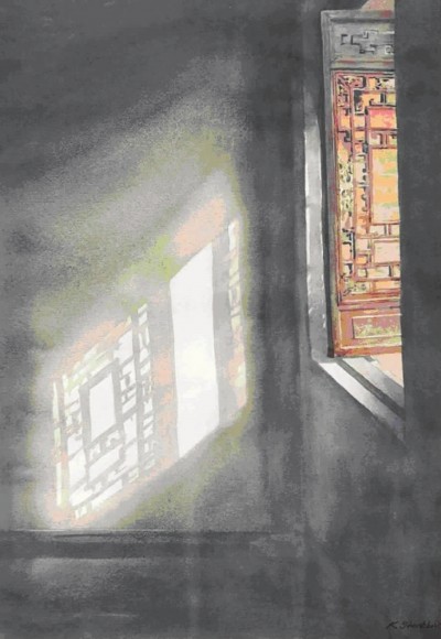 用光来构图,用色来造型,用笔来写神,陈希旦渐渐明晰了这样的水彩画创作目标,让画面自然而然流淌出东方韵味。比如他描绘建筑物时,就借鉴过不少中国画的用笔,建筑的墙面以国画中的“枯笔”利用水彩纸表面的凹凸纹理加以呈现,而建筑比较细腻的地方,运用的则是类似国画中的“皴”法。