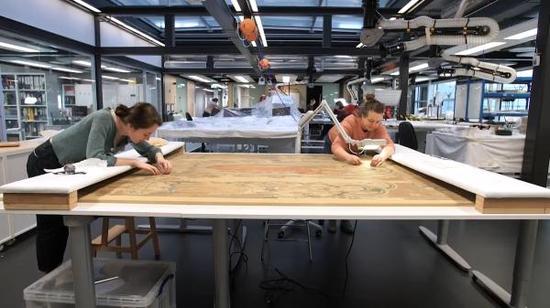 此前的修复是依靠成千上万的针脚来将作品固定在合适的位置,但是现在的固定会有些不同。修复师们需要在刺绣表面铺上一层薄薄的网状覆盖物,然后通过这张网在支撑板上缝制,所以不必像早期修复时那样用到那么多缝针了。