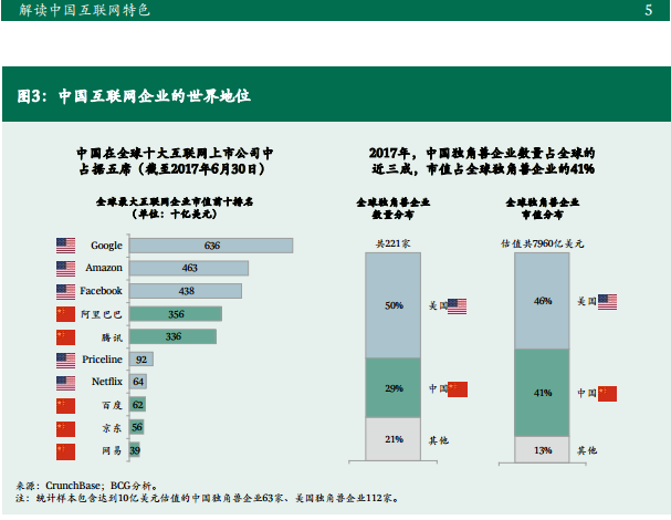 据波士顿咨询公司发布的《解读中国互联网特色》报告(以下简称“报告”)显示,2017年全球独角兽企业共有221家,而中国独角兽企业数量占全球的近三成;从市值来看,当前全球独角兽企业总市值为7960亿美元,中国独角兽企业市值占了41%,整体市值较高。